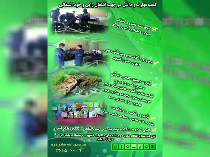 کارگاههای فنی و مهارتی در هنرستان امام صادق با استفاده از تجهیزات پیشرفته و مدرن برگزار میشوند. معلمان متخصص و مجرب در این مجموعه، دانشآموزان را به شیوهای عملی و تجربی آموزش میدهند تا مفاهیم تئوری را در عمل نیز تجربه کنند. این آموزشها نه تنها مهارتهای فنی دانشآموزان را افزایش میدهد، بلکه خلاقیت، تفکر منطقی و توانایی حل مسئله را نیز تقویت میکند.