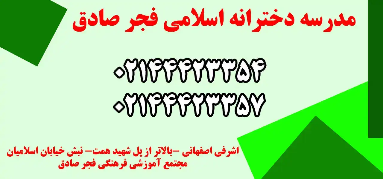 آدرس: تهران- اشرفی اصفهانی -بالاتر از پل شهید همت- نبش خیابان اسلامیان -مجتمع آموزشی فرهنگی فجر صادق