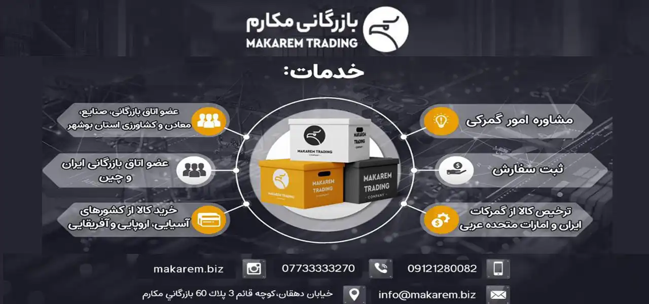 شرکت بازرگانی مکارم با مدیریت جناب آقای مکارم به عنوان یکی از پیشروان در زمینه ترخیص کالا و امور بازرگانی شناخته میشود. این شرکت با بهرهگیری از نیروی انسانی متخصص و با تجربه و دانش بالای قوانین و مقررات بازرگانی و گمرکی، بیش از 35 سال است که به فعالیت موفق در زمینه واردات و صادرات، ترخیص کالا و مشاوره امور گمرکی میپردازد.